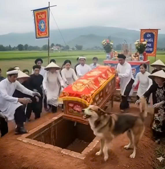 “Vàng! Mày làm gì đấy? Im đi!” – ông Ba quát, mặt tái mét, cố kéo con chó ra. Nhưng Vàng không nghe, nó gầm gừ, nhe răng, mắt long sòng sọc nhìn quan tài.