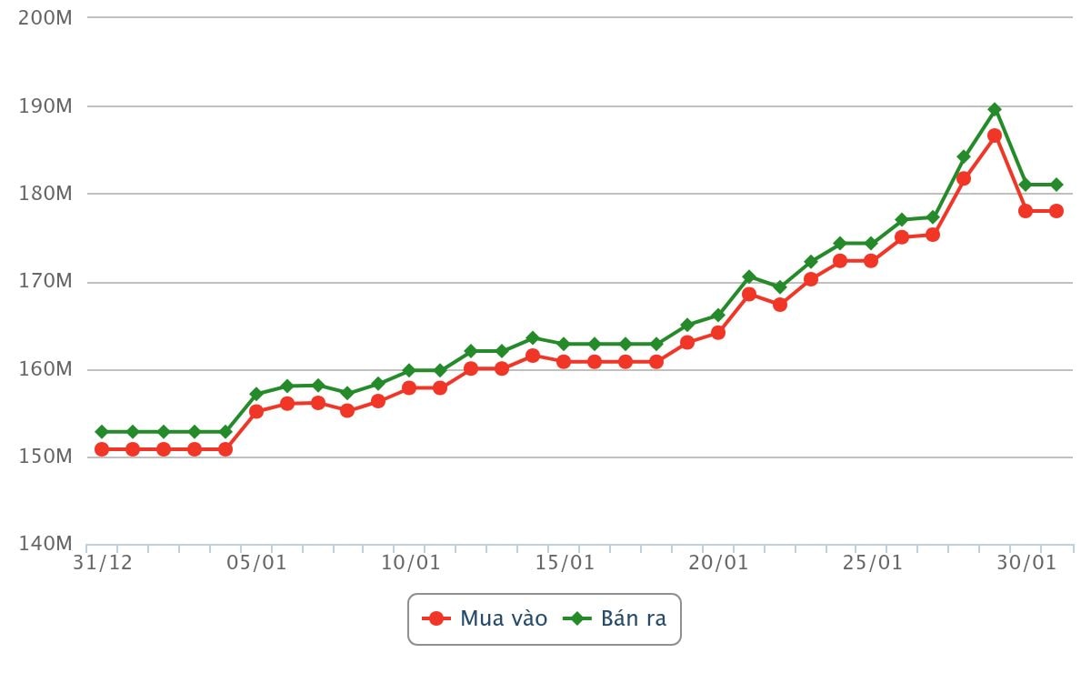 Trước đó, trong phiên 30/1, giá vàng trong nước biến động mạnh khi các doanh nghiệp liên tục điều chỉnh với biên độ lên tới vài triệu đồng/lượng chỉ trong vài giờ. Sau khi được điều chỉnh giảm từ 189,6 triệu đồng/lượng xuống còn 180,1 triệu đồng/lượng (chiều bán ra) trong phiên sáng, giá vàng miếng SJC đã phục hồi nhẹ trở lại, lên mức 181,6 triệu đồng/lượng trong phiên chiều.