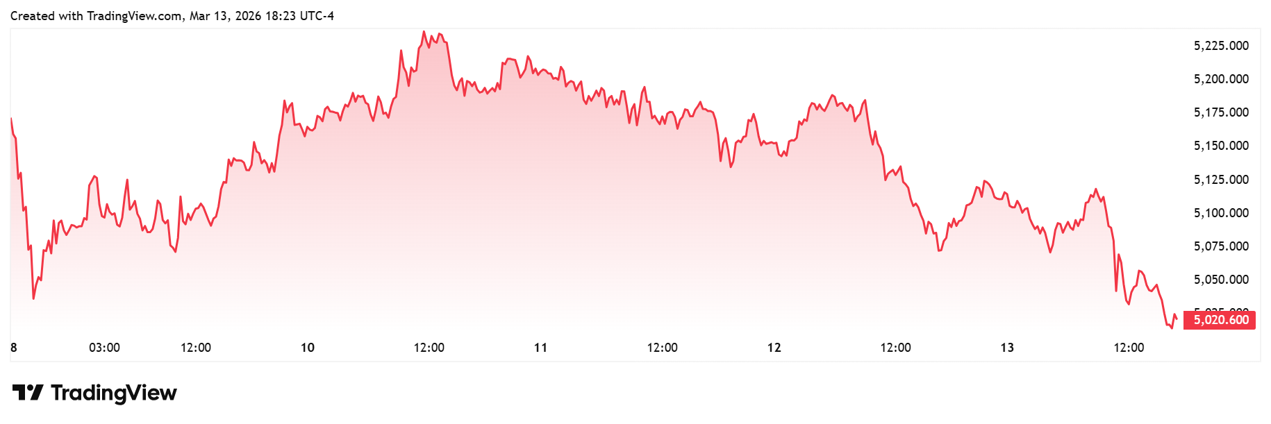 Giá vàng đã dao động quanh mức 5.000 – 5.240 USD/ounce trong tuần này, tăng đều đặn đến sáng thứ Ba, sau đó giảm chậm kéo dài đến chiều thứ Sáu khi các nhà đầu tư ngày càng lo ngại về khả năng xảy ra một cuộc chiến tranh kéo dài và phức tạp hơn ở Trung Đông.